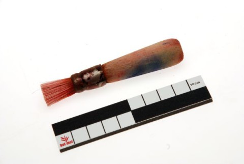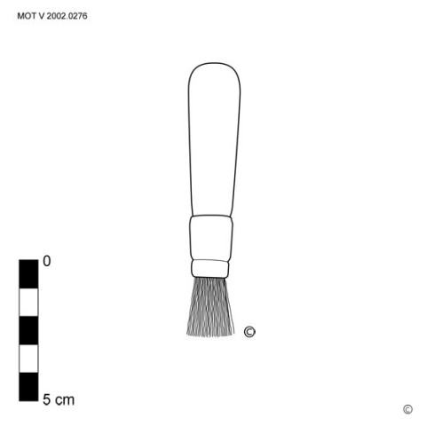 The stencil brush consists of a round and straight-cut brush of firmly short (approx. 2 cm) white pig bristles (width approx. 0.4 - 3.7 cm), partly surrounded by a metal sleeve in which, on the other side, a short (approx. 6 cm) wooden handle sticks. [MOT]