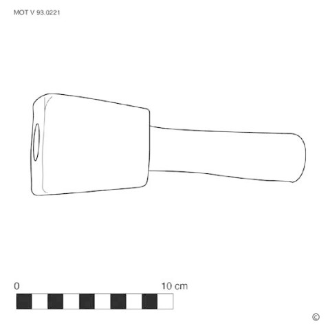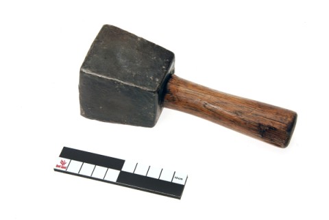 Metal carver's mallet is a metal hammer with a short handle (approx. 10 cm) in the center of the base of a cylinder or the top of a truncated cone, as with the wooden carver's mallet. It can also be square with sides that diverge wider towards the end of the hammer head. With this mallet you can give powerful blows and it is mainly used on hard stone types in combination with a chisel.