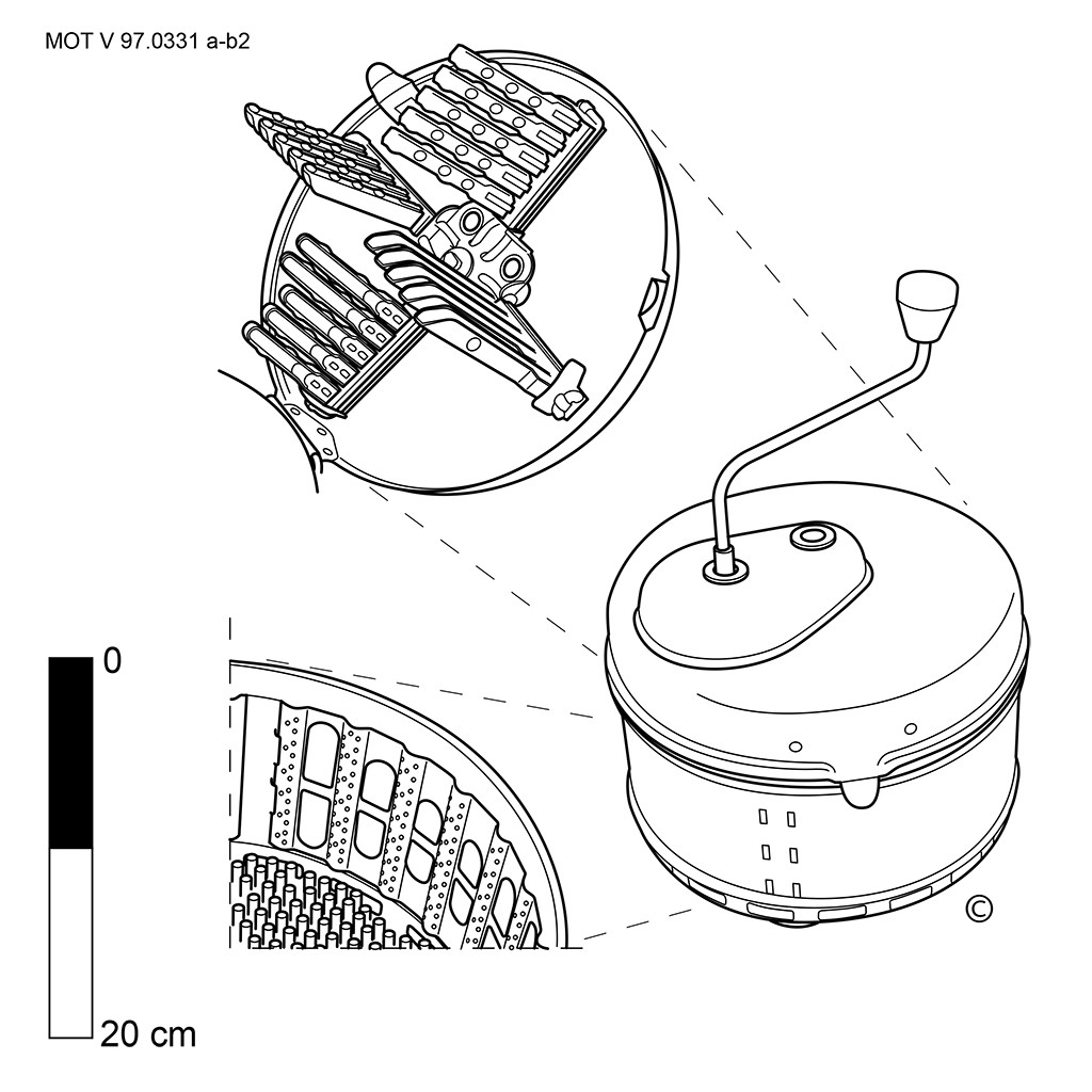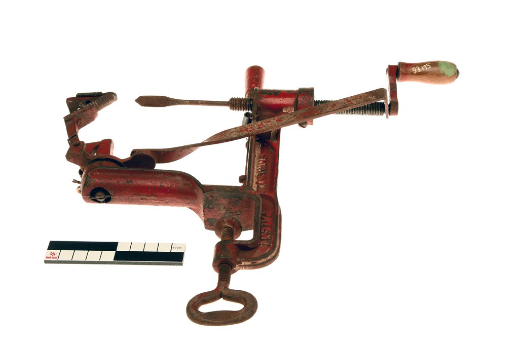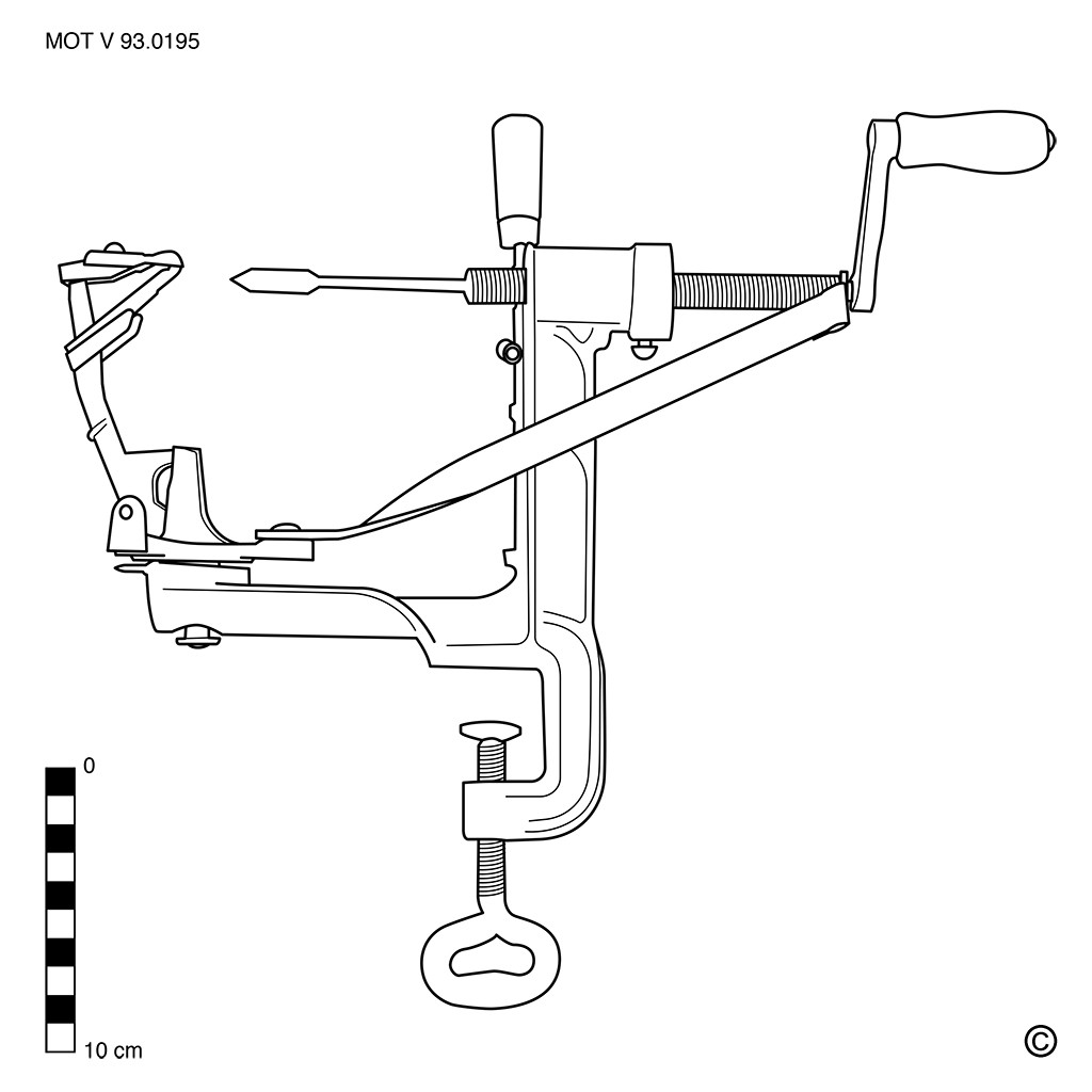 Keukentoestel dat op de rand van een tafel of aanrecht geklemd wordt en waarmee appelen en aardappelen geschild worden. Het heeft een schroefvormige as met een speervormig uiteinde, die met een draaizwengel in beweging wordt gebracht. Het mesje, dat de vorm van een vingernagel heeft, is bevestigd aan een verende arm. Men prikt een (aard)appel op de speervormige punt van de as, men draait aan de zwengel en de (aard)appel beweegt zich naar het mesje toe. Wanneer dat mesje de draaiende (aard)appel raakt, beweegt het er vervolgens volledig omheen en wordt de schil er in één keer afgehaald. Wanneer men de hendel bovenaan het apparaat ontspant, kan het mesje terug in de beginpositie gebracht worden.