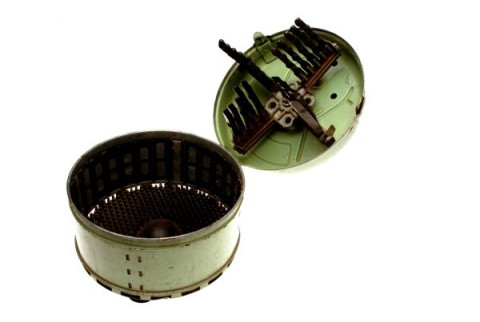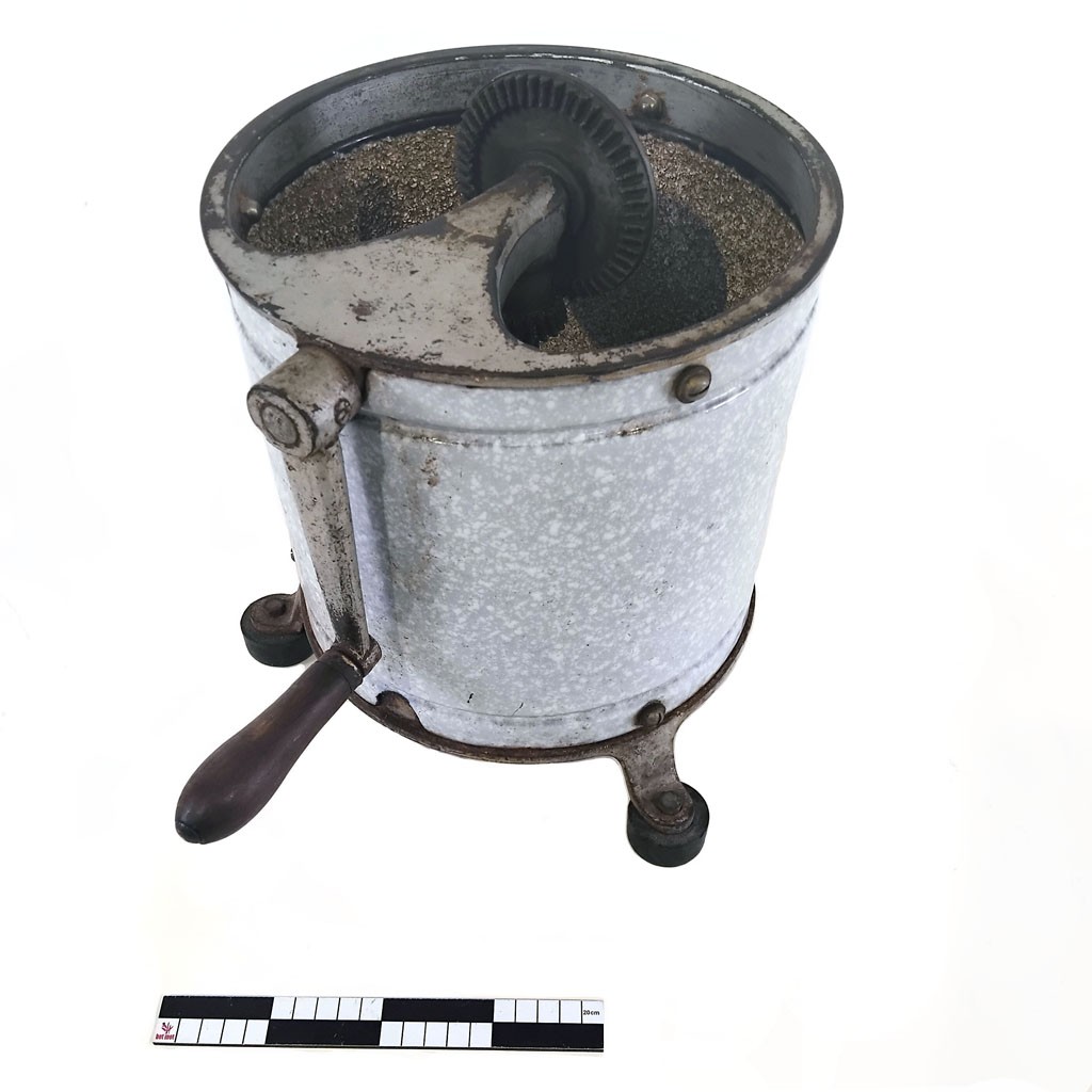 Voor aardappelen en sommige groeten maakte de Franse fabrikant Jean Mantelet, een ander model dat bestaat uit een afsluitbaar recipiënt (diam. ca. 25 cm) met gegolfde ruwe binnenzijde en een rubberen noppenbodem. Het werkend deel is aan het deksel bevestigd en wordt door een zwengel aangedreven. Het bestaat uit een kruis met telkens een vijftal U-vormige profielen, langs de buitenzijde voorzien van kleine ronde uitstulpingen met minuscule perforaties, bevestigd aan vier verende rubberen armen. Vier rubberen noppen op de onderzijde van het recipiënt voorkomt het wegglijden. De te schillen groenten (bv. bonen, radijzen) of aardappelen worden in het recipiënt gelegd. De ruwe delen van de draaiende U-vormige profielen en de ruwe rand schuren over de schil zodat deze wordt verwijderd. [MOT]