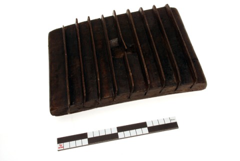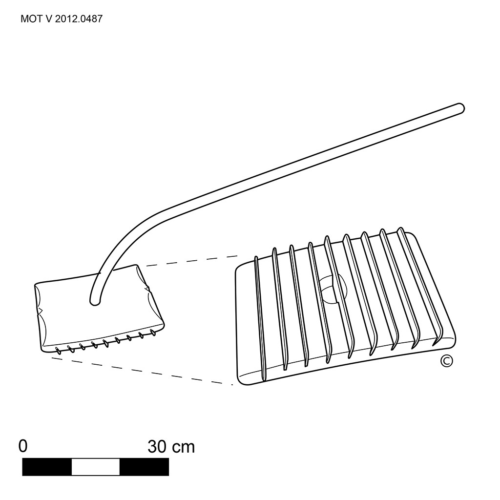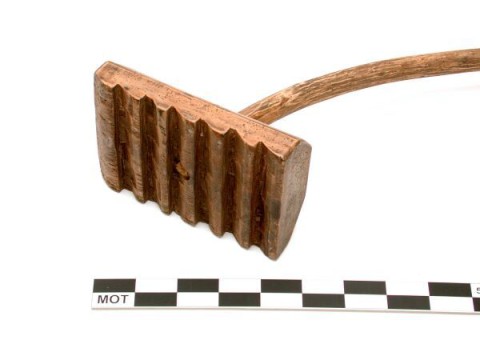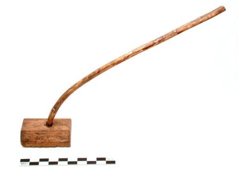 De bookhamer met geribde onderzijde zou dienen om te braken of te brakelen, d.i. voor het breken van de droge houtachtige delen van de gerote vlasstengel voor het werk met het zwingelmes (4). Men klopt op de liggende stengels tot de houtpijpjes over de hele lengte verbrijzeld zijn. [MOT]