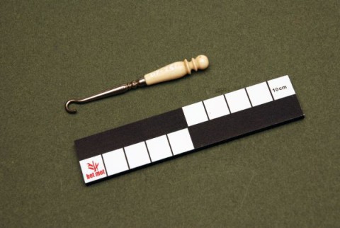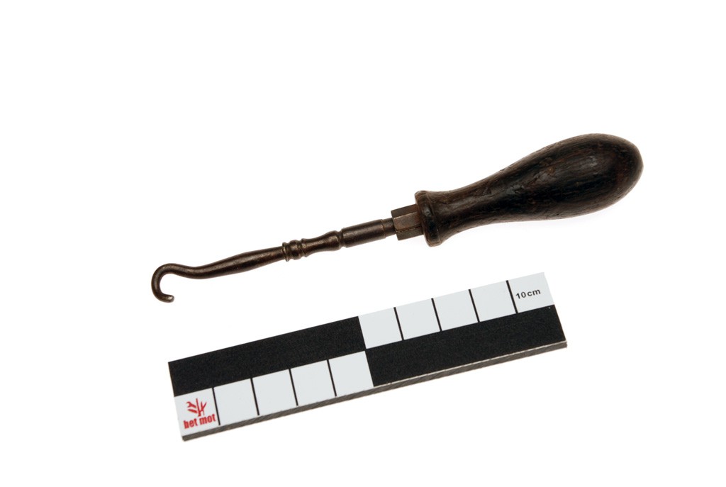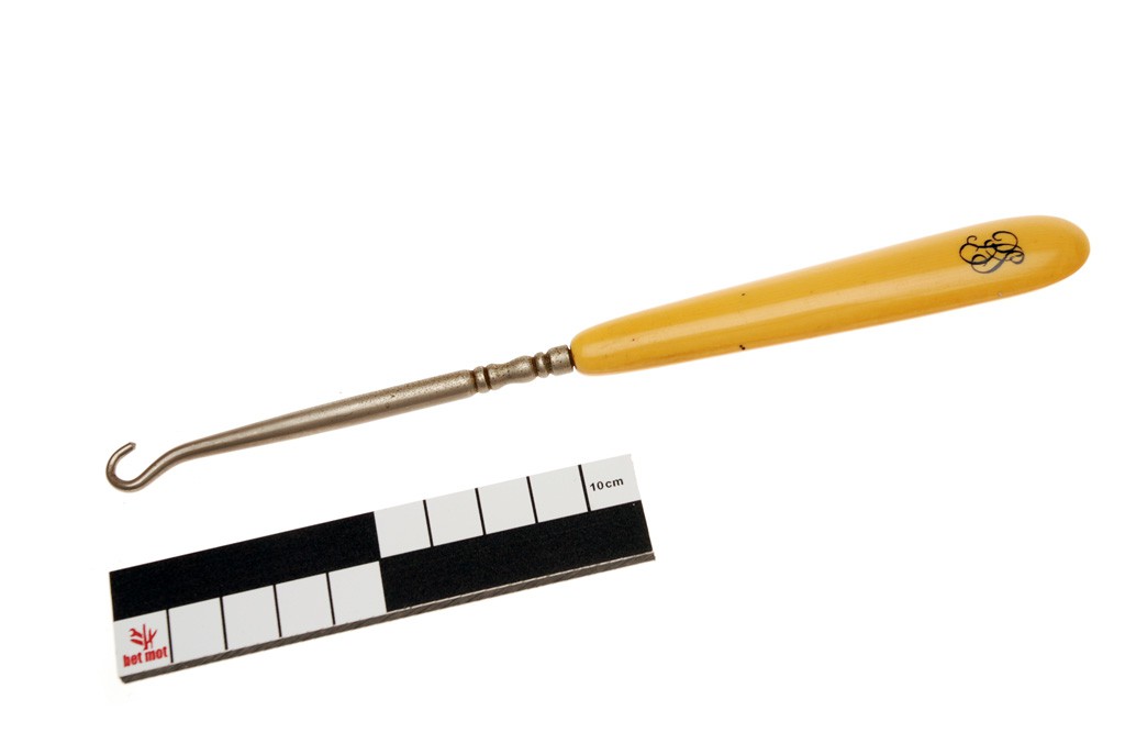 Le crochet à bottines est un petit crochet en fer (environ 10 cm) - souvent avec une poignée (décorée) en fer, en bois, en os ou en ivoire - avec lequel les bottes pour dames étaient nouées (1). Il existe également un modèle avec deux crochets de tailles différentes. Un autre modèle est pliable.