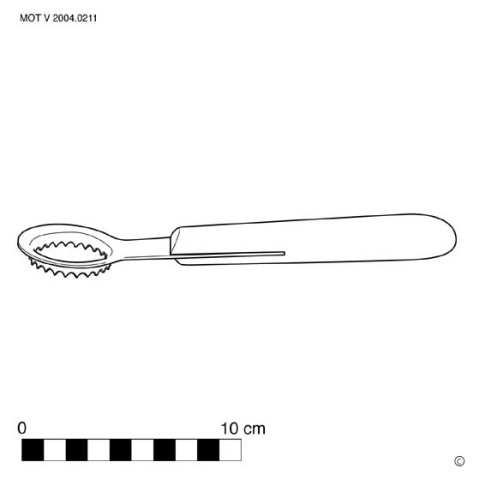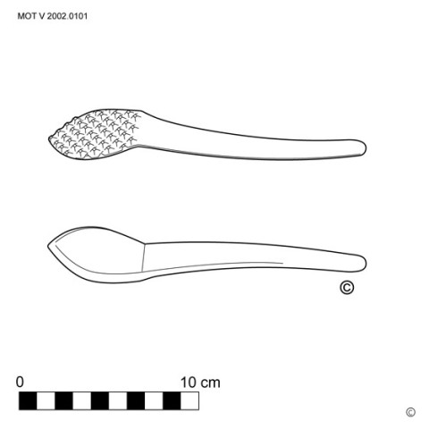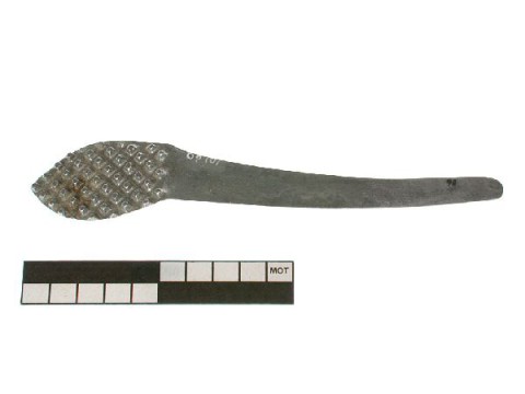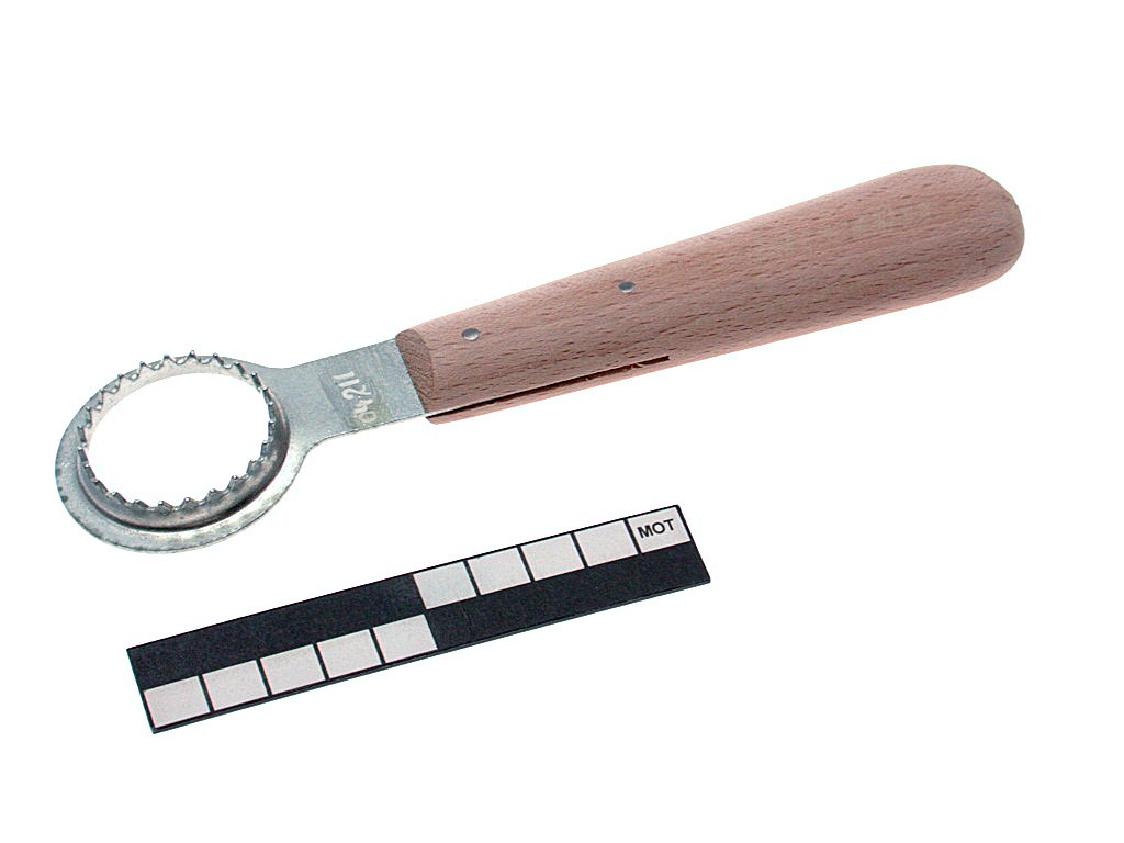 The metal, always serrated, blade of the fish scaler can be in the shape of a ring or triangle, a hair brush (1) or a dough scraper (2). The (wooden) handle forms an obtuse angle (approx. 5 °) with the working part or is attached to it with a kink.