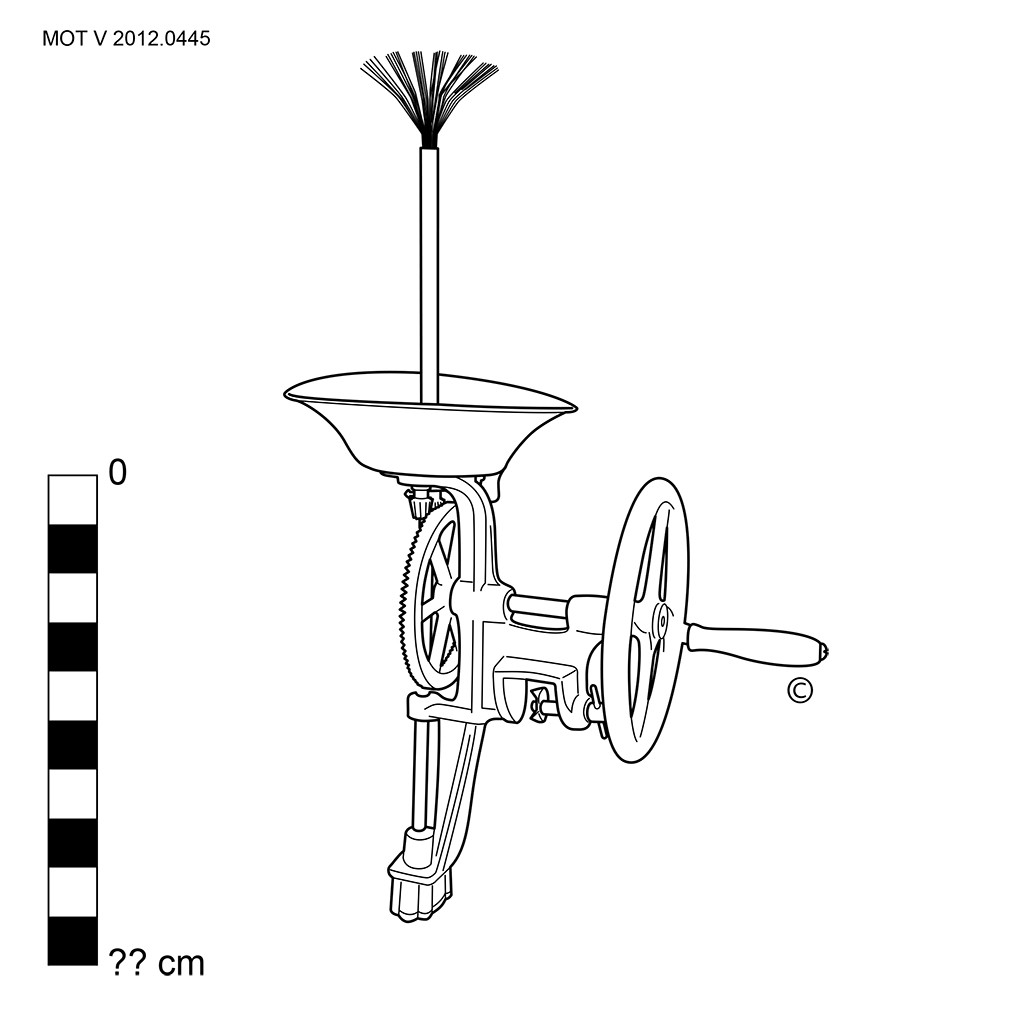 Het werkend deel van het flessenspoeltoestel is gemaakt uit een bundel stalen bladveren eindigend in draadstalen borsteltjes. Het wordt bovenaan het toestel in draaiende beweging gebracht door een zwengel. Een buisje dat zich op de stang onder het borsteltje bevindt kan naar boven worden geschoven om zo de borsteltjes samen te vouwen zodat hij in de fles kan. Door het buisje terug naar beneden te schuiven gaan de borsteltjes uit elkaar en kan men de fles aan de binnenkant schoonborstelen. Het toestel wordt aan de rand van een kuip bevestigd met het onderste deel, de pomp, in het water. Door aan de zwengel te draaien wordt het water opgevoerd om de fles tevens te spoelen. Het vuile water wordt opgevangen door de koperen schotel die zich onder de stang van de borsteltjes bevindt, en afgevoerd via een slang. [MOT]