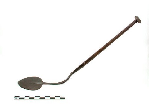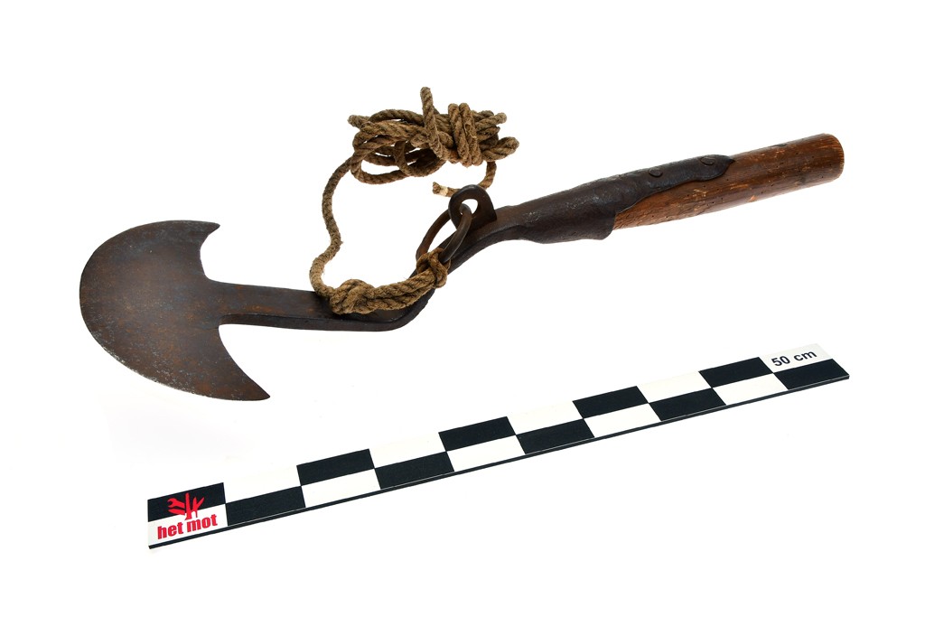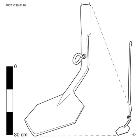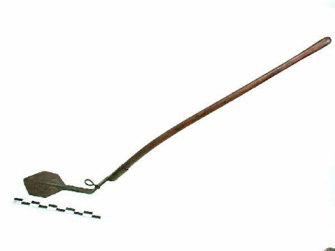 Outil fait d’une lame métallique (env. 25x25 cm) de forme variable – triangulaire, hexagonale, en forme de goutte, de croissant, de cœur – montée sur une tige courbée (env. 30 cm), pourvue ou non d’un anneau, se terminant par une douille dans laquelle on emboîte un manche droit ou légèrement courbe à boule ou en T (env. 100-150 cm). La lame est donc parallèle au sol, tandis que le manche forme avec la partie travaillante un angle d’env. 135°. Il existe aussi un modèle nettement plus lourd dont le manche est plus long et se termine par une poignée en T de 50-60 cm de large, qui repose sur la cuisse de l’ouvrier (1).
