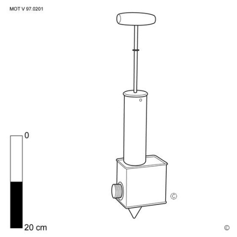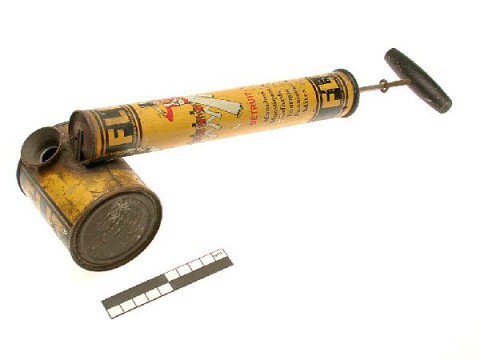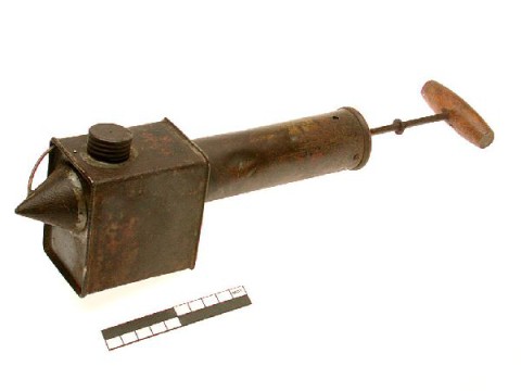 Iron, copper or plastic syringer with reservoir (0.250 - 0.5 l), which works by negative pressure: the air jet created by the pump sucks up the liquid and spreads it in very fine droplets.