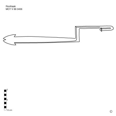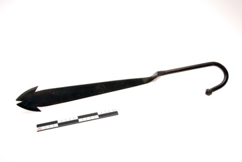 Il s'agit d'une feuille de métal d'environ 30 à 50 sur 4 à 5 cm avec des encoches latérales vers l'arrière, dont une extrémité est pliée perpendiculairement. Une poignée métallique est forgée à cette extrémité qui se termine par un crochet.